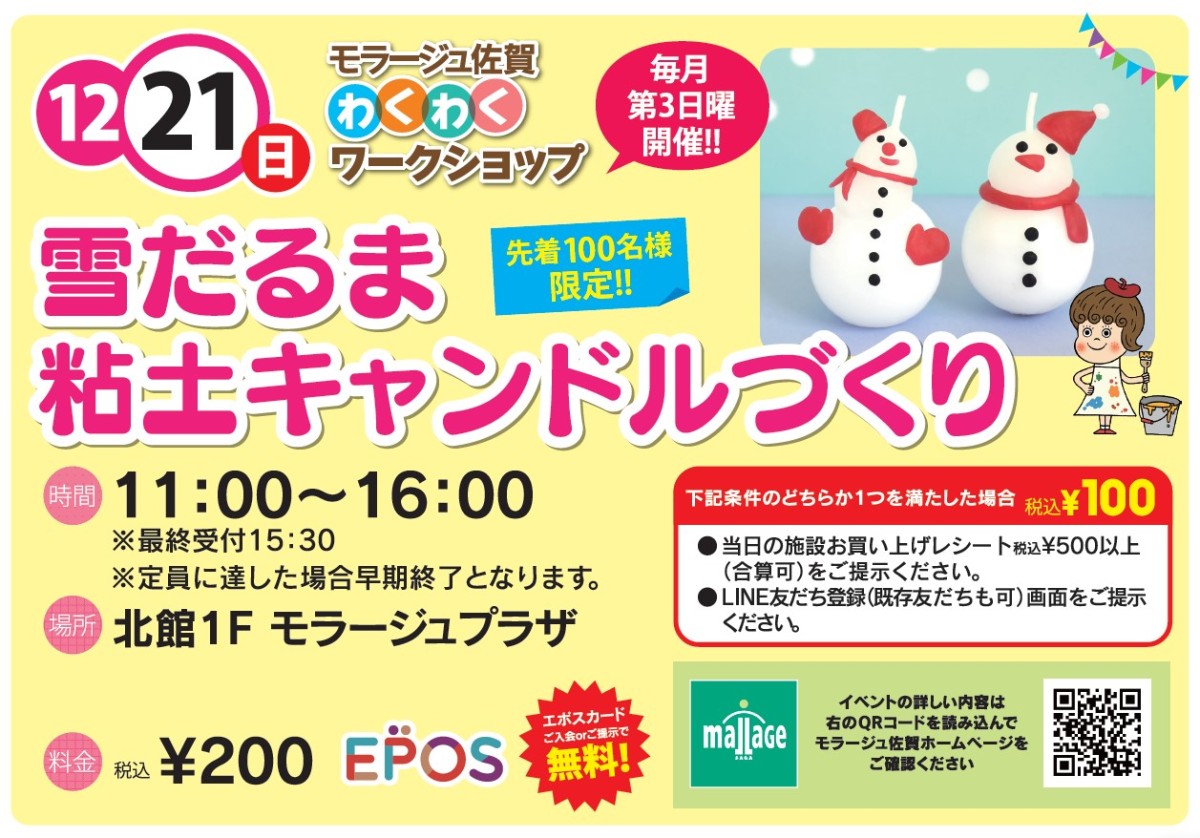モラージュ佐賀では、「雪だるま粘土キャンドルづくり」のワークショップを開催致します。
